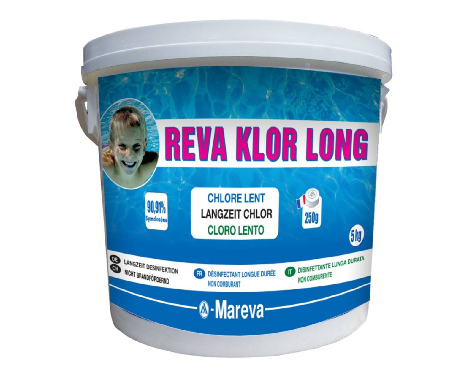 REVA KLOR LONG Mareva à Rocbaron : galets chlore longue durée pour piscines. Désinfection efficace, anti-algues et confort de baignade garanti.