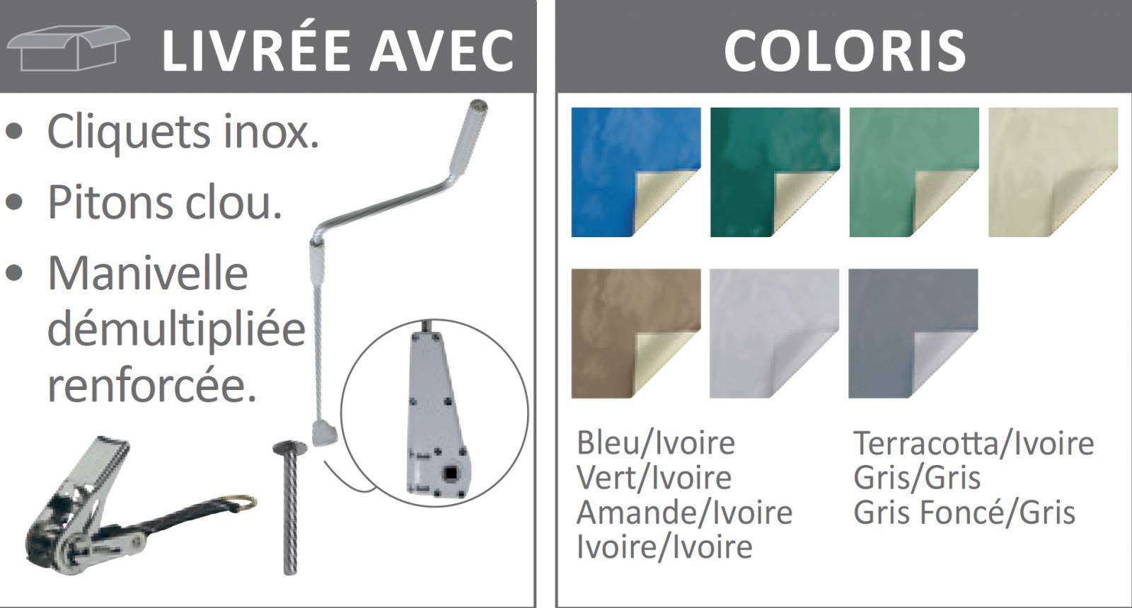 - Mise en place : La bâche se tire facilement grâce à sa sangle et se met en tension à l’aide de 3 cliquets inox.