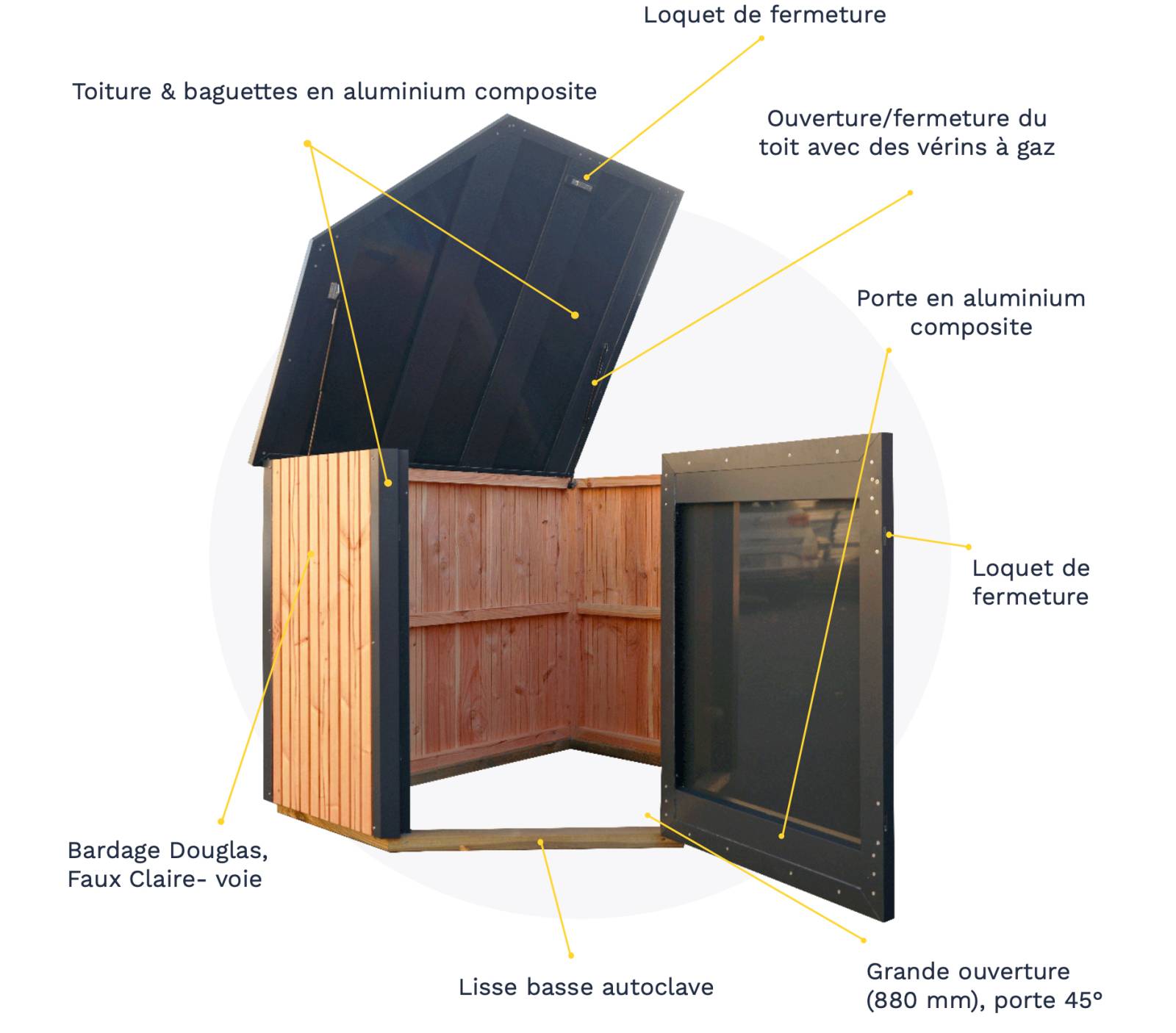 Le local technique « Le 45° » se distingue par son design harmonieux qui allie bois et aluminium. Cette fusion de matériaux confère à ce local une esthétique moderne, tout en garantissant une grande solidité et une parfaite intégration dans votre espace extérieur.