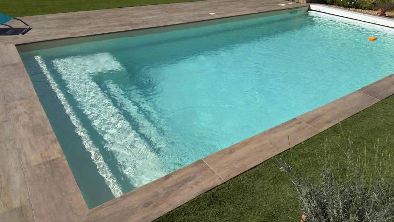 Cette superbe piscine avec plage immergée en version 8,30m existe également en 7,30m et 9,30m avec le même fond plat de 1,45 mètres. La Sherry Lounge 8 se distingue par son design épuré alliant élégance classique et modernité. Son escalier aux grandes marches et sa plage immergée latérale offrent un confort inégalé pour la détente et les loisirs aquatiques.